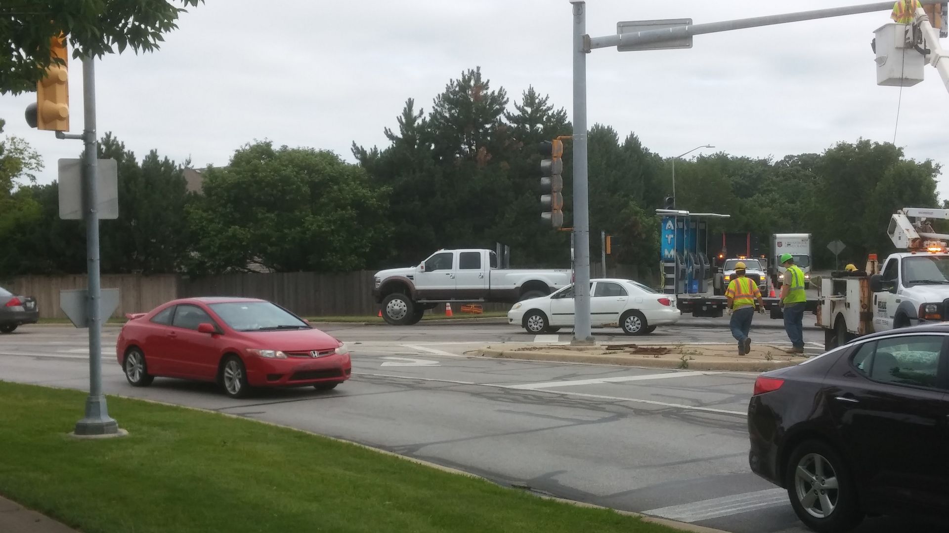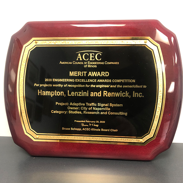 Hampton, Lenzini and Renwick, Inc. (HLR) worked closely with the City of Naperville on this multi-phase project to upgrade the communications, equipment, and operations of 32 signalized intersections primarily located along the heavily travelled Washington Street corridor. Along with being the traffic signal timing consultant for this project, HLR provided construction observation services for the two phases of construction. The primary goal of this project was to install and implement an Adaptive Signal Control (ASC) system to improve travel time, reduce congestion, and prolong the effectiveness of traffic signals. The system uses wireless magnetometers to monitor traffic volumes and adjust the traffic signal timings in real time. The magnetometers are installed in the pavement in a series that record traffic volumes and vehicle occupancy and relay it to the central traffic signal system. The central system software uses tested algorithms to makes adjustments to the amount of green time in each direction. This is different than a traditional traffic signal corridor optimization, which is based on a snapshot of typical traffic signal volumes and programmed fixed time-of-day timings. The typical corridor optimization is performed every five to ten years depending on the development of the area.
