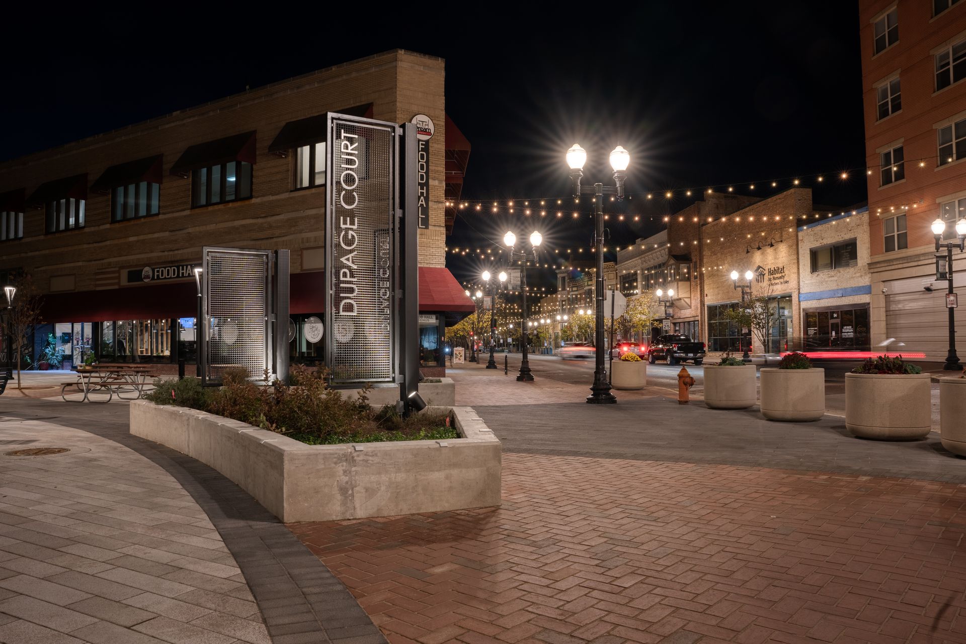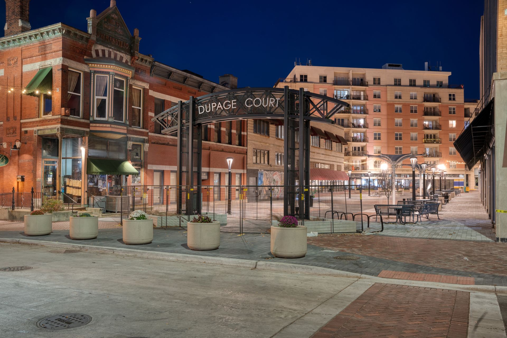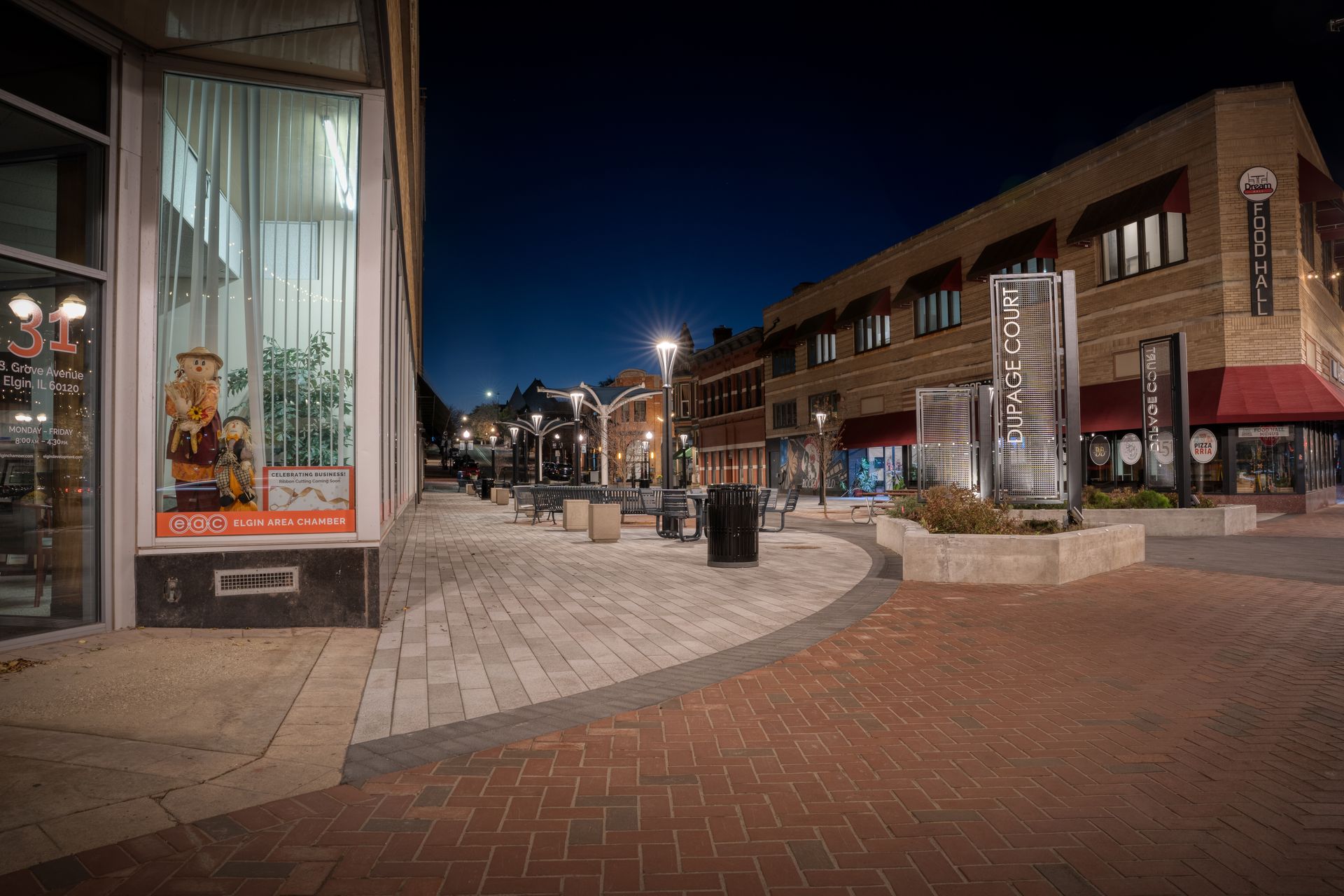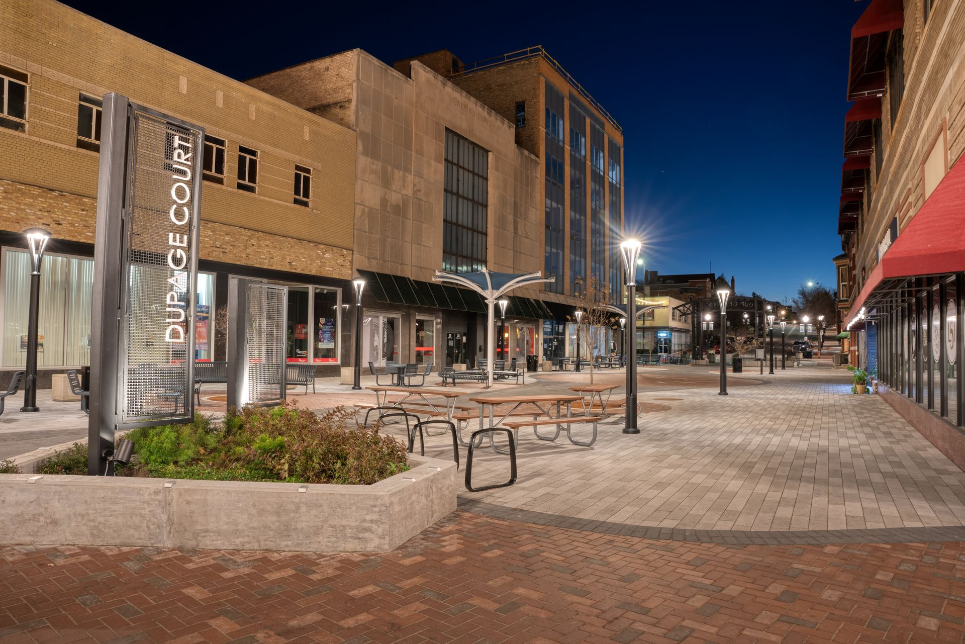 The revitalization of DuPage Court aimed to elevate its role as a central gathering place for the community, integrating modern design elements with functional upgrades. Before initiating the project, the City of Elgin engaged local business owners in a collaborative process to understand their needs, desires, and concerns. Their feedback shaped the project’s goals to create a flexible and adaptable space that could meet the demands of the next 50 to 100 years.
