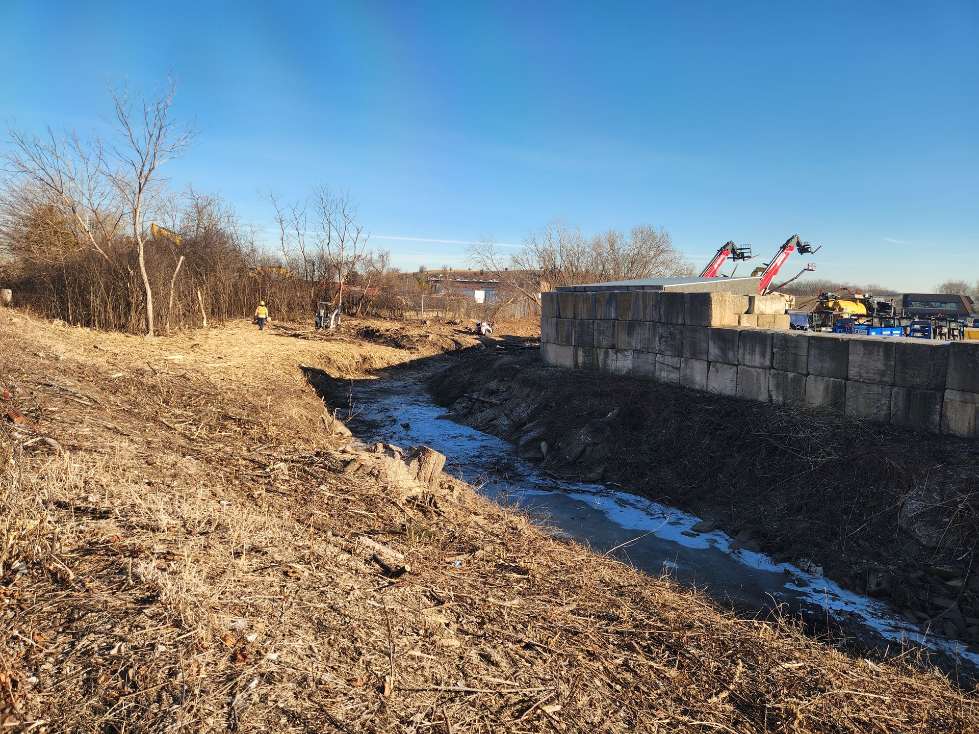 Field efforts include multiple rounds of targeted herbicide applications, invasive species removal, woody vegetation clearing, erosion repairs, and native seeding to restore ecological function and improve stormwater performance. Work is sequenced by watershed to prevent recontamination from upstream sources, and all activities are carefully coordinated with businesses to minimize disruption.