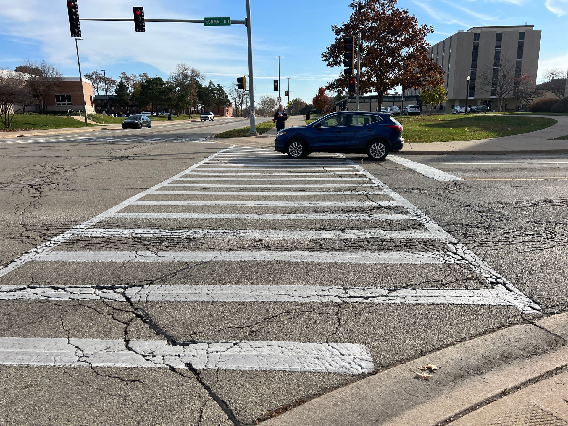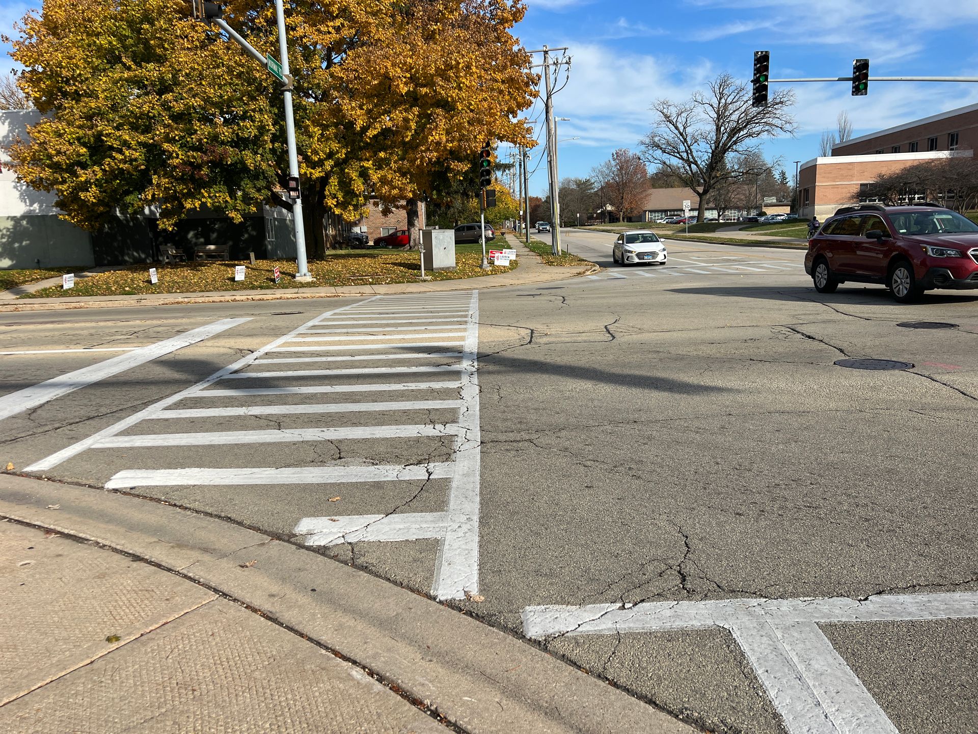 Evaluate the suitability of a roundabout at Lucinda and Normal and design it to ensure it stays within the existing intersection right of way. Northern Illinois University’s Disability Resource Center is located at this intersection, so the roundabout was enhanced to provide additional accommodations, ensuring that all users could safely navigate the pedestrian crossings.
