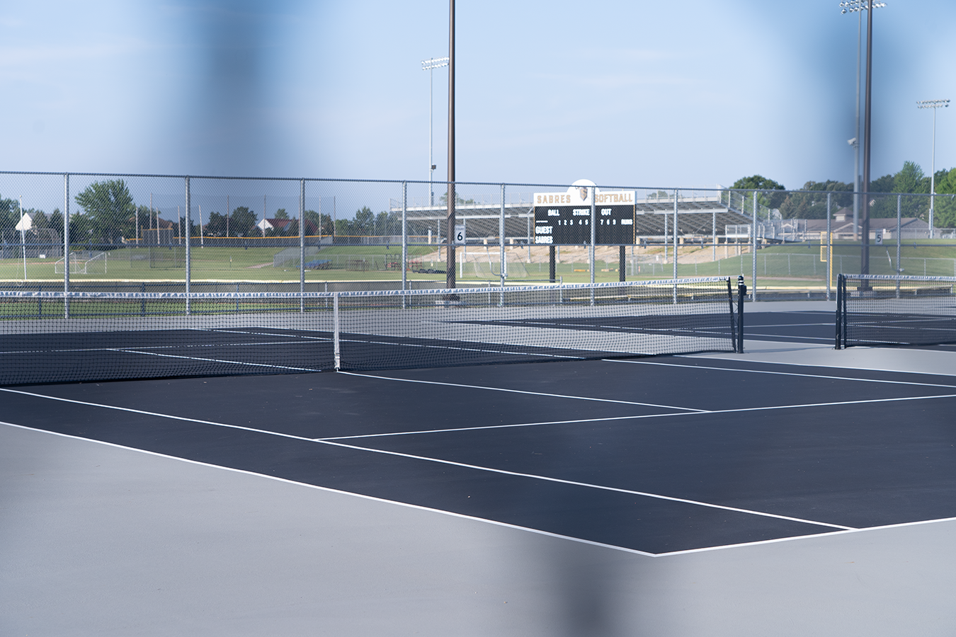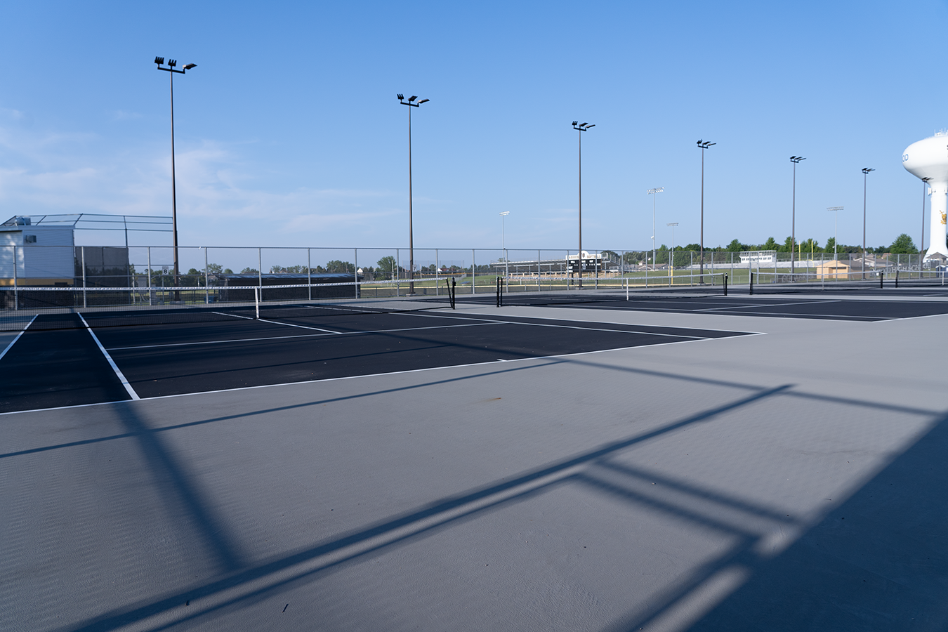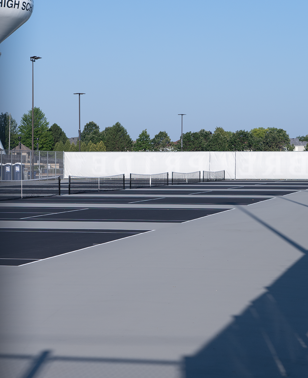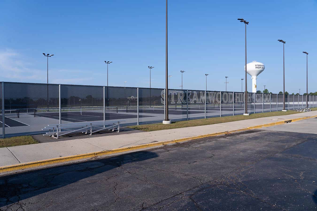 The plans consisted of full-depth removal and replacement of all eight courts at Streamwood High School. The replacement was necessary to eliminate safety concerns caused by the severely cracked surface of the tennis courts. The plans included installing a new fence around the courts and underdrains to collect groundwater, which had been causing flooding on the adjacent softball field. Additionally, a tennis court lighting system was added to enable the facility's use for practice and tournaments in the evening.