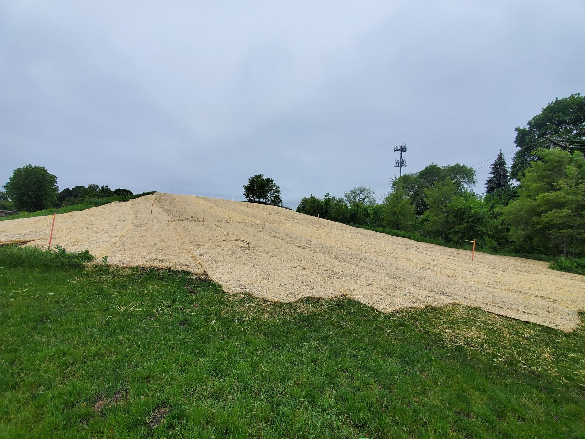 HLR mowed the top and sides of the hill in late March 2021 to prepare the site for its first year of maintenance. The mow removed built-up vegetation to prepare the site for soil installation. The Fox Valley Park District installed 3 inches of topsoil to increase the height of the slope and accelerate the conversion to a native prairie. HLR then seeded the entire site with a custom native seed mix, which included fast-establishing grasses and forbs. Canada wild rye, side-oats grama, sand coreopsis, and purple prairie clover are fast-growing natives that were included in the seed mix. The native plant species will help stabilize the area, making it difficult for non-native species to emerge. After seeding, HLR provided and installed an erosion control blanket on the northeast slope, where sledding occurs.