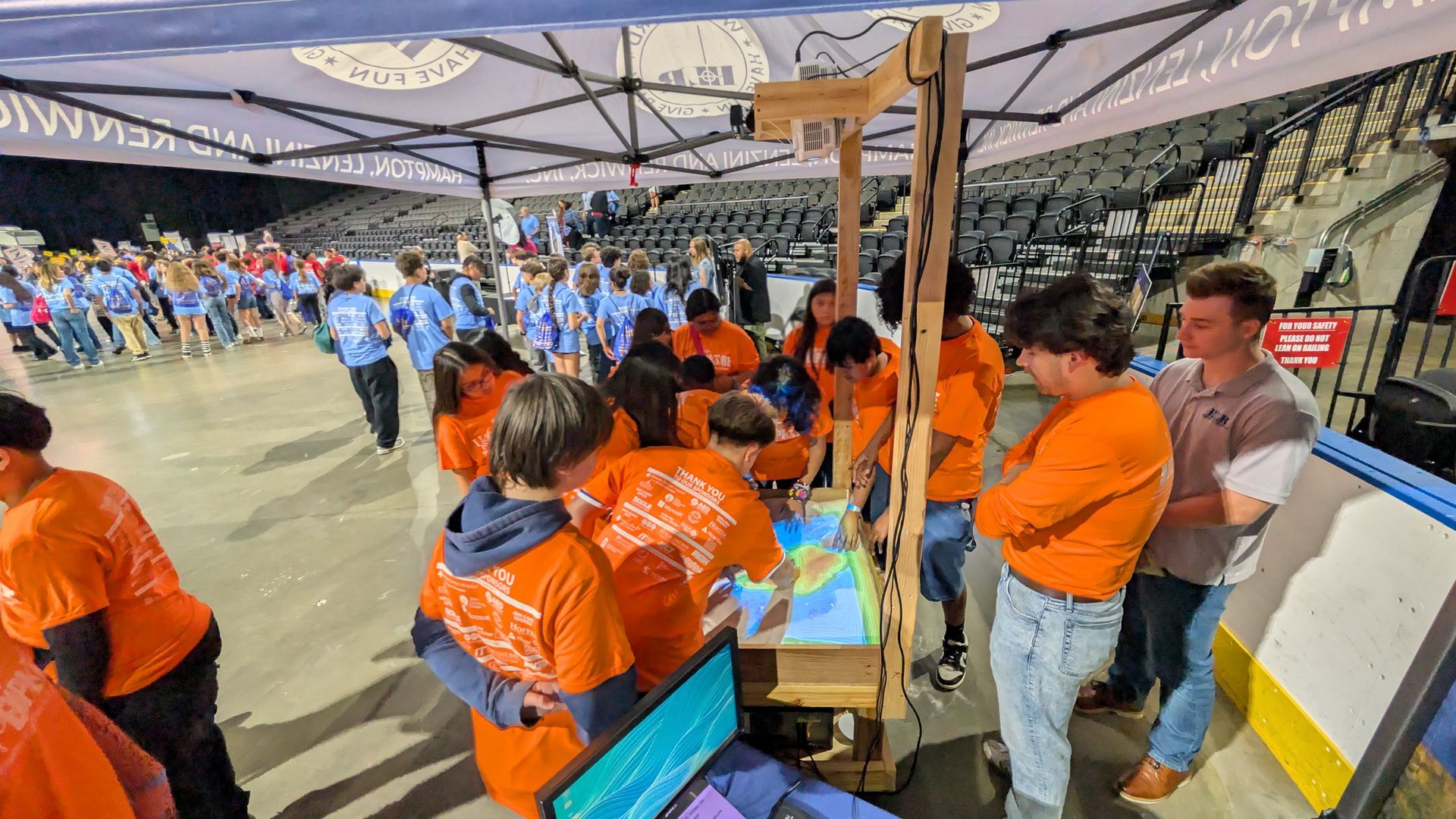 Representing the Manufacturing, Engineering, Technology, and Trades pathway, HLR joined more than 60 local businesses, industries, government agencies, and nonprofits. Our booth featured a crowd favorite—the augmented reality (AR) sandbox. This interactive 3D tool lets students shape and mold the sand to create their own topographic maps, which are instantly projected in vivid color. When they simulate rainfall, they can watch how water flows through the elevations they’ve built—making concepts like mapping, topography, and watershed behavior come alive.